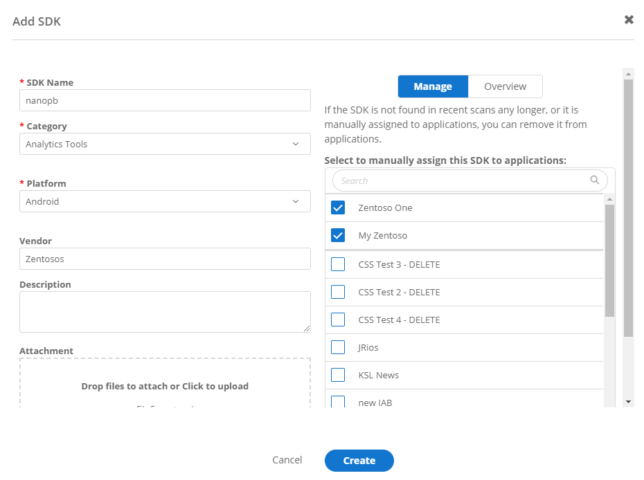 | Mangage | Select the Applications the SDK is associated. |